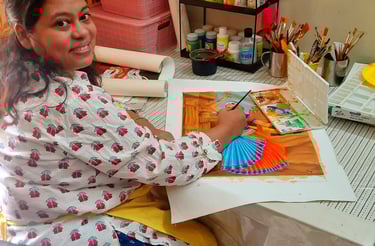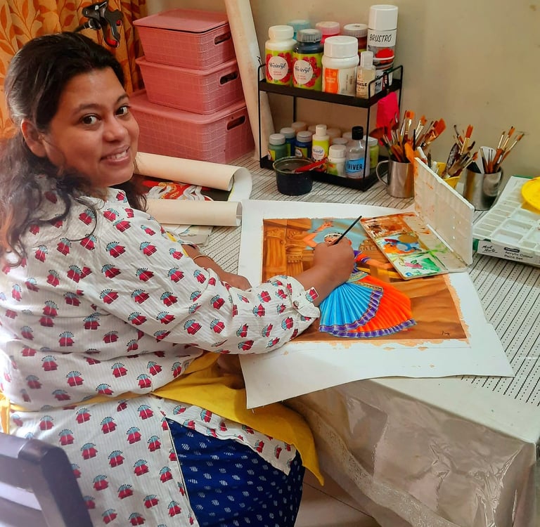 For me the world is a beautiful array of colour and flamboyance, which inspires me with my art. My art is not born out of technicalities, but of a vivid imagination and my love for colours. I get my motivation from people and places, around me. Although I do not follow any particular art style, but sometimes I loves to blend different Indian art forms together to create something unique yet a beautiful piece!